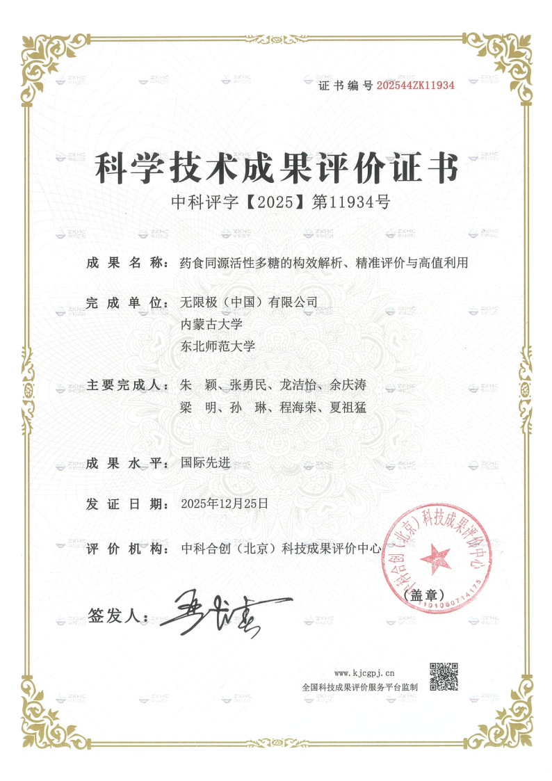 近日,这个问题迎来了突破性答案。由无限极携手内蒙古大学、东北师范大学联合完成的“药食同源活性多糖的构效解析、精准评价与高值利用”项目,通过了权威成果评价,被专家组一致认定为达到“国际先进”水平!这项重大突破,用现代科学解码了灵芝、香菇等传统中草药“好在哪儿”以及“怎么好”的核心秘密,让传承千年的养生智慧有了国际级的科学背书。